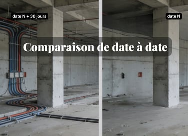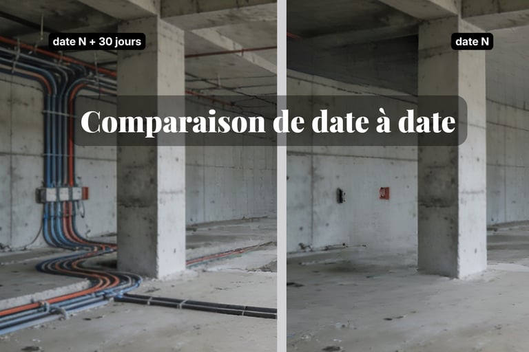 Accédez à la visite 3D du chantier à différentes dates et basculez instantanément d’une étape à l’autre pour voir l’évolution (avant/après, pré‑cloison / post‑cloison, etc.).